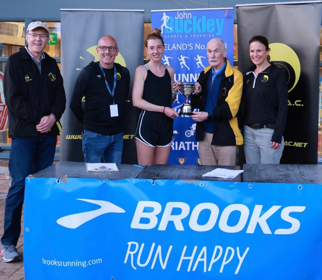 The Eagle AC Cheetah Run at Fota Wildlife Park on Thursday May 18th 2023 was an unforgettable evening. There was a buzz of excitement around the wildlife park that only the Cheetah Run can bring. This was a very special evening for the club, marking the the first presentation of the ‘Anne Lucey Murphy Memorial Cup’ to the winning lady on the night. The 1st lady home was Hannah Steeds of Leevale AC, a talented runner finishing in a time of 17:33. Annes husband Joe Murphy presented the cup to Hannah, and her name will now be first engraved on a list of many talented female runners in the coming years. A fitting tribute to a valued clubmate, a much loved runner & photographer in Cork. Michelle Kenny also of Leevale AC took 2nd place in 17:51 and Kealey Tideswell of Clonmel A.C. was 3rd in 17:57. Brilliant running by the ladies.