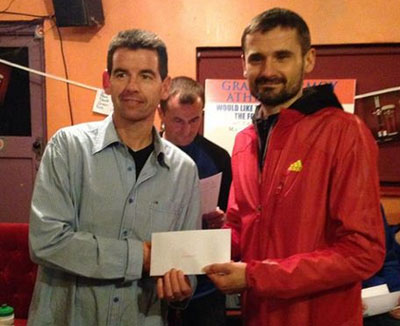 Pat O’Connor (L) receiving his 2nd M45 prize from Sergiu Ciobanu, one of the top marathon runners in the country