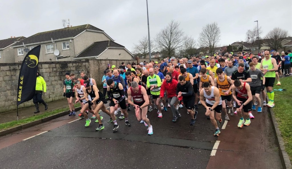 The return of races has certainly brought back a buzz that we have missed over the past two years, with the cancellation of so many events due to Covid-19. The atmosphere on the morning of Sunday 20th of February in Carrigaline was a true testament to this. This could be remembered as the year of the storms, but we managed to find a window and slotted into the alphabet between ‘Dudley’ ‘Eunice’ ‘Eagle Race’ and ‘Franklin’ to hold our 33rd Annual 5 Mile race, a tribute to a former club member Mr Tommy Ryan. This was Ruairi Egan’s 3rd year as race director but the first in-person event that the club has been able to host in those 3 years, & Karen Bevan slotting in as assistant to learn on the job. The race serves as both a club fundraiser and contributes traditionally to 2 charities, Carrigaline Meals on Wheels & Forόige Youth Development Organisation Carrigaline. This year we were delighted to be offered a lead motorbike from the Irish Blood bikes and in thanks added this charity to our race donations. Eagle AC is continually grateful for the ongoing sponsorship of this event by The Edge Sports, Kinsale road.