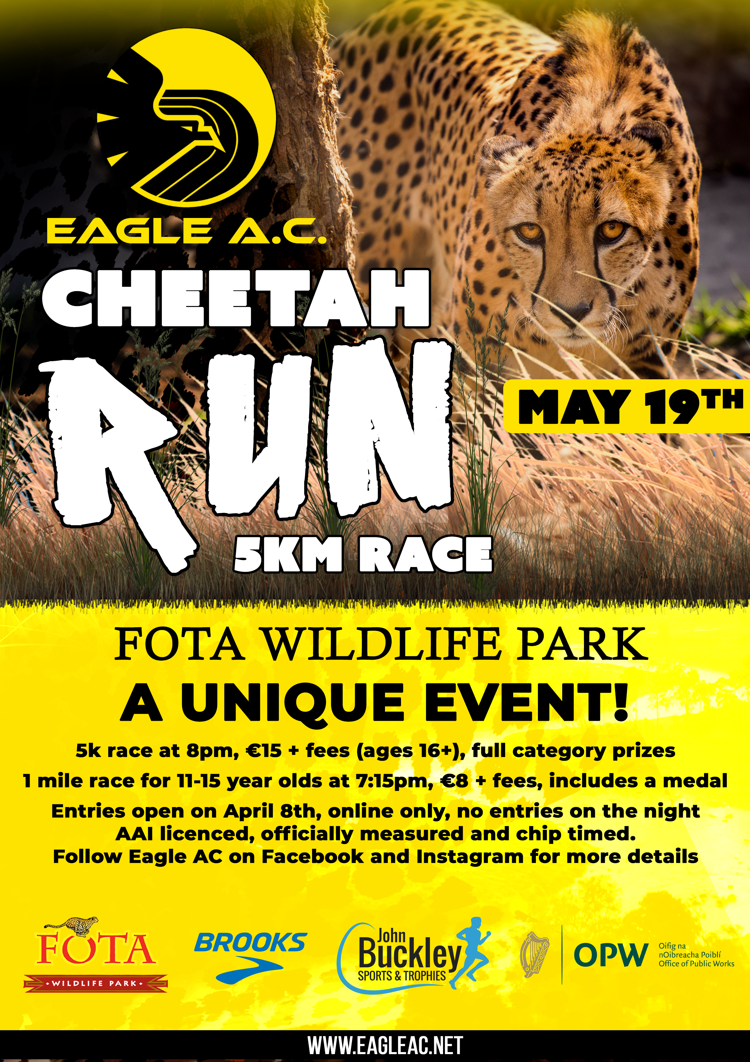 Eagle AC together with Fota Wildlife Park and with the co-operation of the OPW, are delighted to announce the return of the Eagle AC Cheetah Run 5km race for 2022.