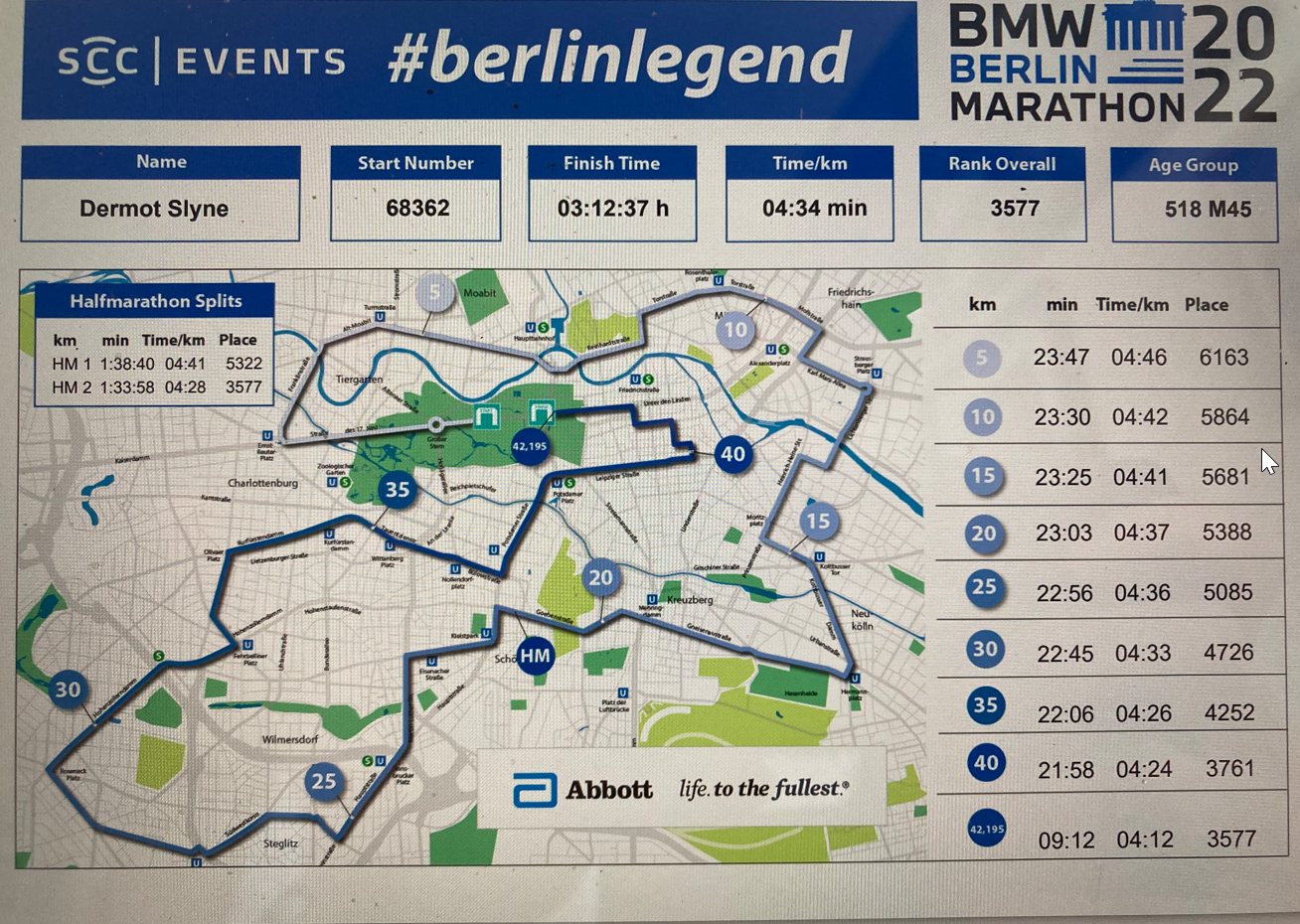 We watched as the elites went off. Then it was our turn…….. I have to say the first half of the race went very well. I went through the half in 1 hr 40. Very happy with that. It wasn’t until mile 20 when I thought oh ya I forgot these get tough around now but thankfully did not panic. My pacing had gone well I knew that if I kept it below 9 minute miles I should break 3 hr 30. Unfortunately I hit a 9:25 mile at mile 23, I also stopped for a bit as I found the pace starting to get really tough, took on some energy drink and continued on. I managed a few sub 9 minute miles after but mile 26 I hit another 9:25. At 26.2 miles I checked the watch…30 seconds over. No shame in that, Kaka the Brazilian soccer player has a world cup and champion league medal but when it comes to the marathon I have the edge. The official time was 3 hrs 32 mins. Jack completed it in 3 hrs 24 mins, David Woods getting sub 4 hrs and Alan completing it in 5 hrs 36 mins. As I crossed the line there was a tear or two. A tear because after a few years where I felt I was plagued with injuries then Covid coming I feel like I’m getting back to where I need to be. I can’t wait to start training for my next event. What started as a way to bring my friends back down to earth has shot me to the moon.