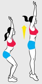 With the knees slightly bent and the arms above the head, do a slight jump into the air and then landing again with the knees slightly bent. Repeat 5 times.